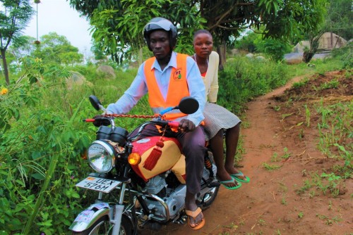 Our motorcycle ambulance transporting madam Betty who is 2 months pregnant, given a referral by our nurses to Namayingo Health center for further attention.