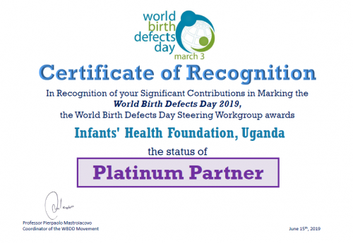 7 years agoInfants’ Health Foundation recognized as a Platinum Partner by the World Birth Defects Day Movement. A movement with over 170 organisations globally aimed to raise awareness about birth defects, with Infants’ Health Foundation representing Uganda and one of the 9 organisations in Africa.