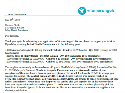 6 years agoWe are highly overjoyed and thrilled for being selected by Vitamin Angels as their grantee of free annual In-Kind grants of various drugs with free shipments from the USA - Uganda. Infants' Health Foundation extends serene thanks to Rebecca Nerima - the Vitamin Angels representative for Uganda and South Sudan. Our bold future will not happen by chance, nor is it inevitable. We will achieve it only by moving together, in swift, conscious effort alongside our government partners and other allies like you Vitamin Angels. No one person or entity will do it alone. Rather, it is each of us taking steps in a collective march toward quality, proactive, universal health care. Infants' Health Foundation and Vitamin Angels, working together to contribute to alleviating micro-nutrient deficiency in Uganda.